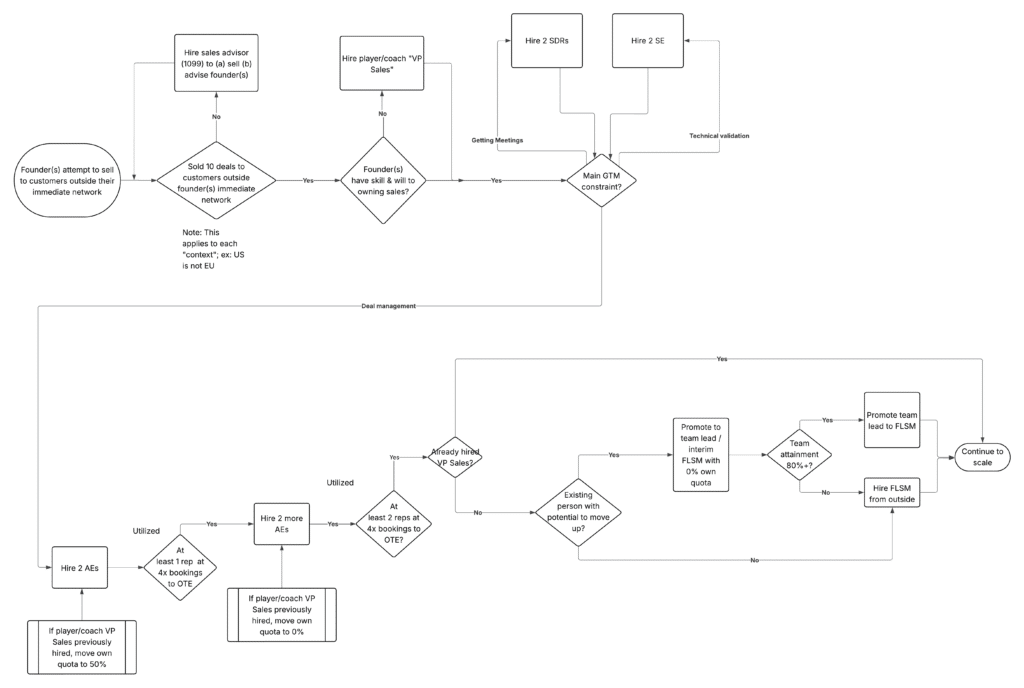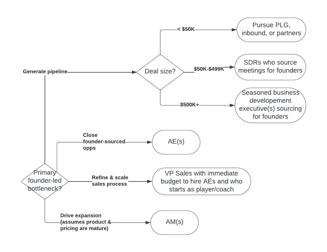 At that point, different founders will face different bottlenecks based on their commercial acumen (Credit: Pete Kazanjy). The flowchart below outlines who to hire next to transition from founder-led sales to founder-assisted sales.